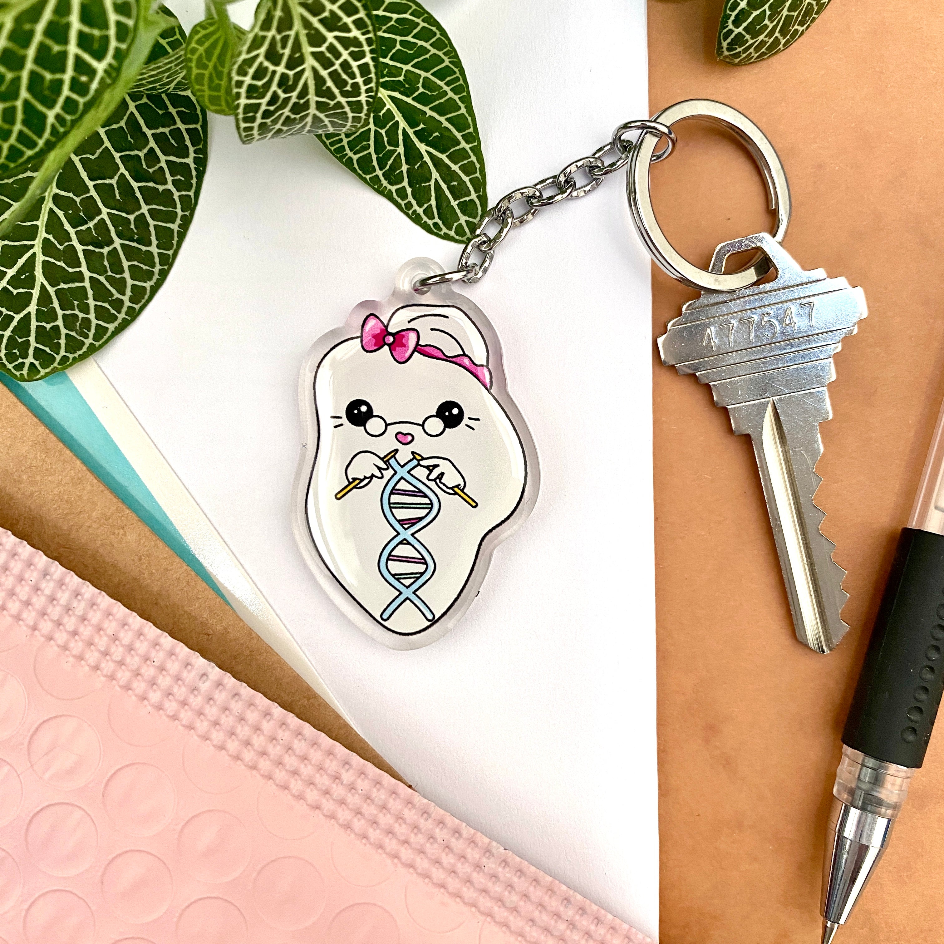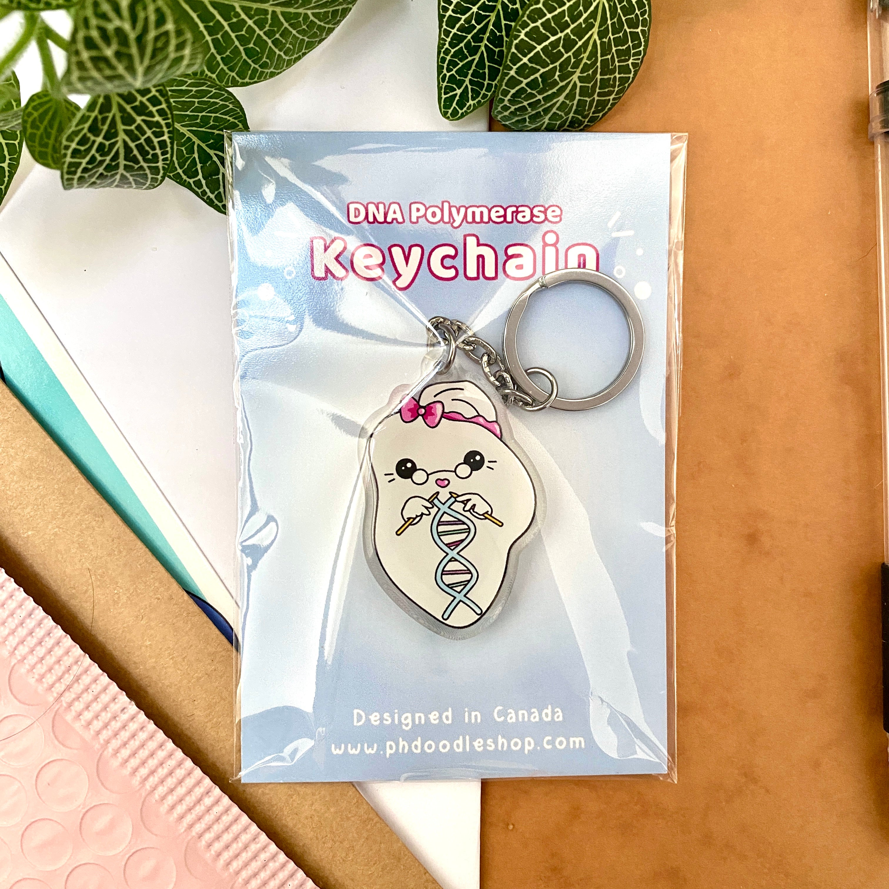 Our DNA Polymerase Acrylic Keychain is the perfect accessory for scientists and biology enthusiasts. Featuring a DNA polymerase as a cute grandma knitting a DNA molecule, this keychain is both fun and educational. Constructed with lightweight acrylic and a secure metal closure, it is the perfect way to add a bit of science to your life!