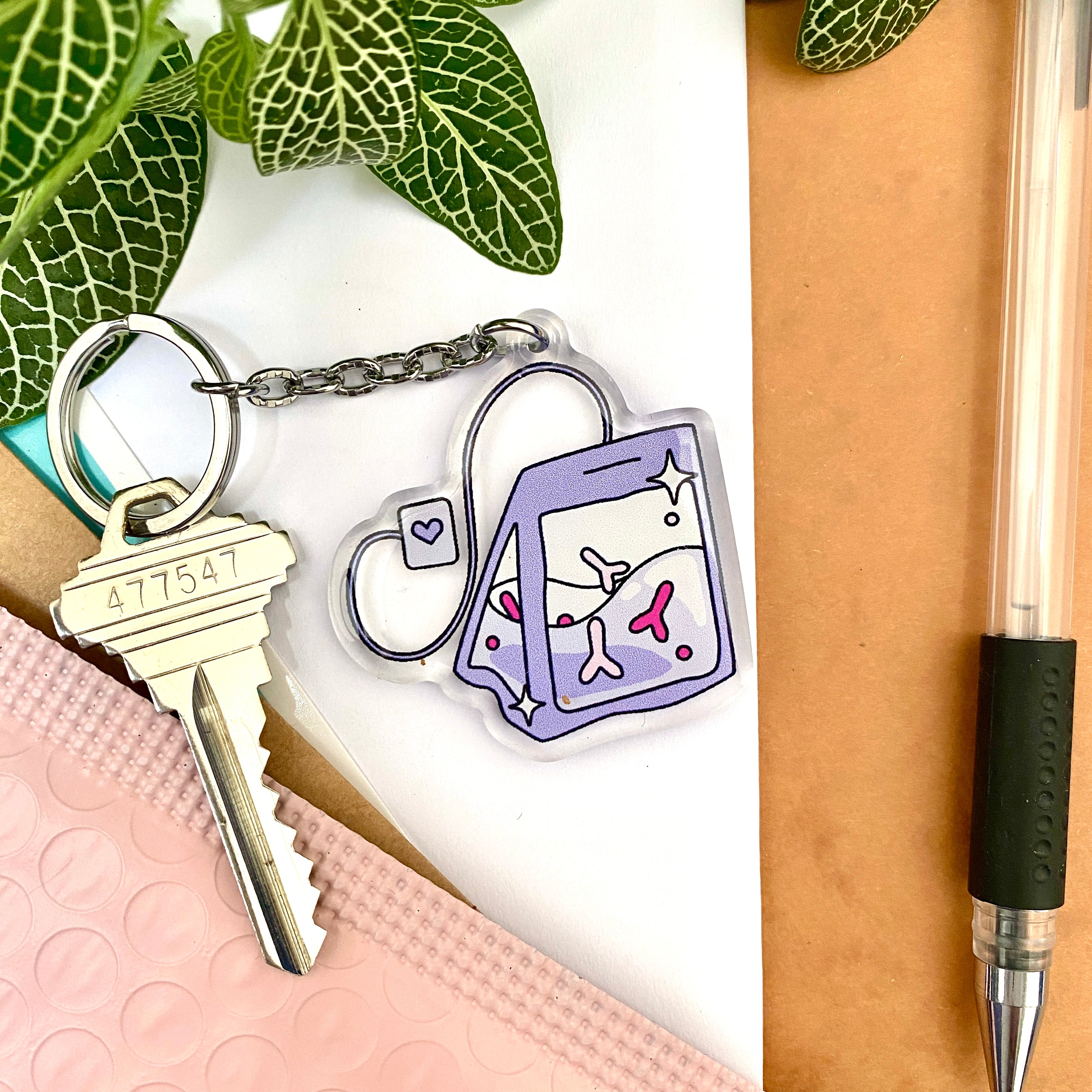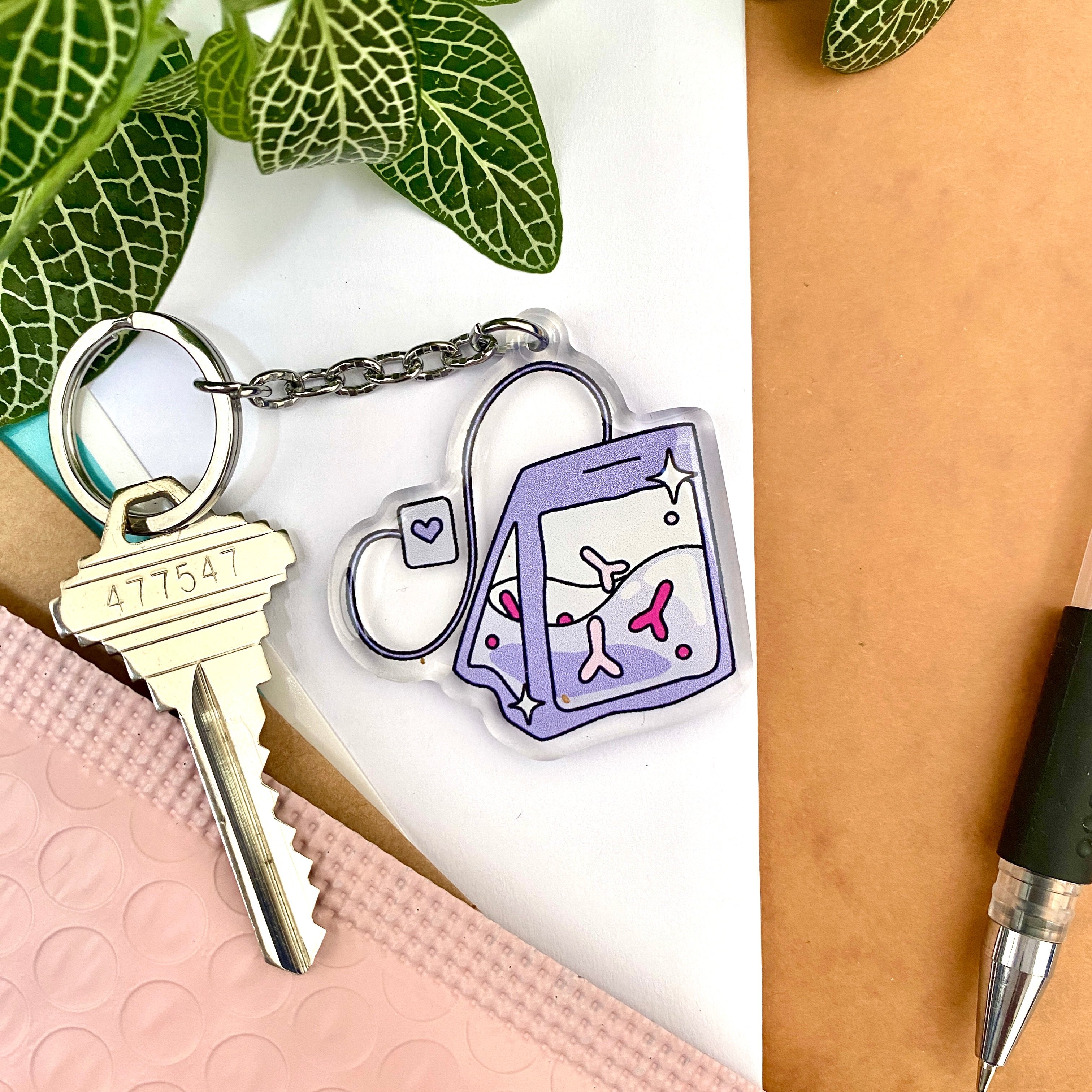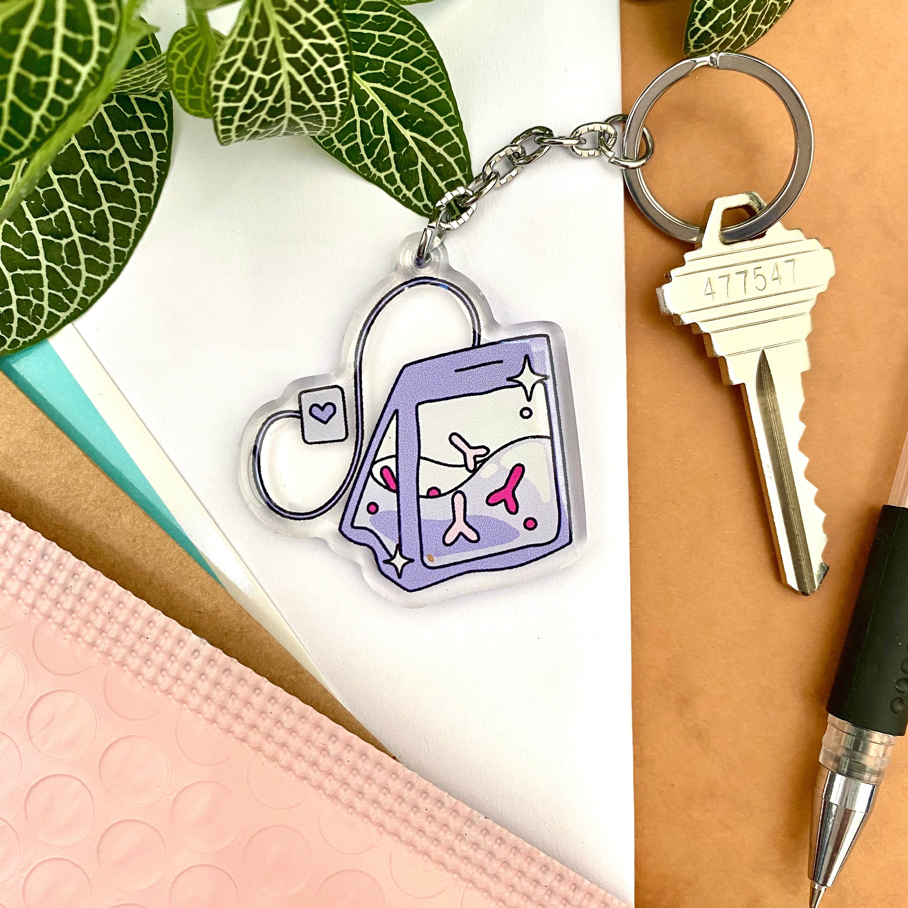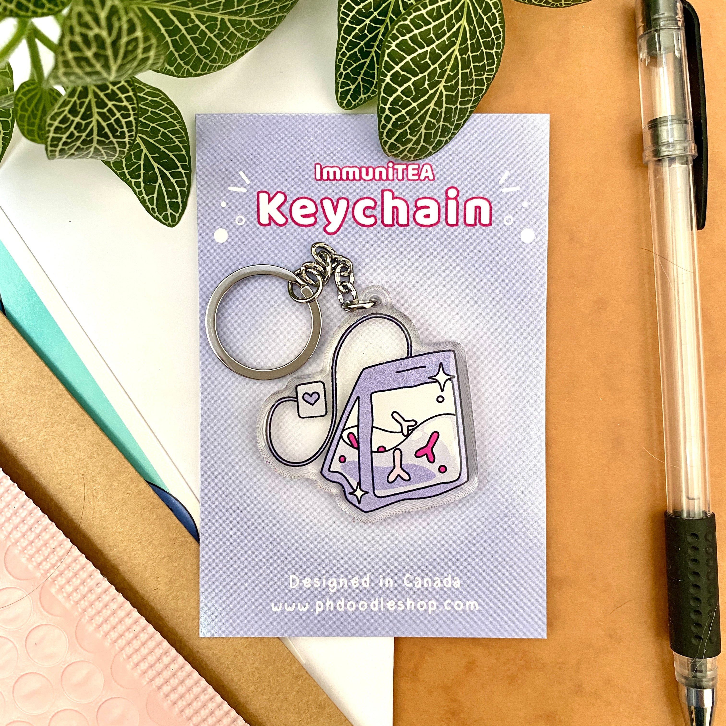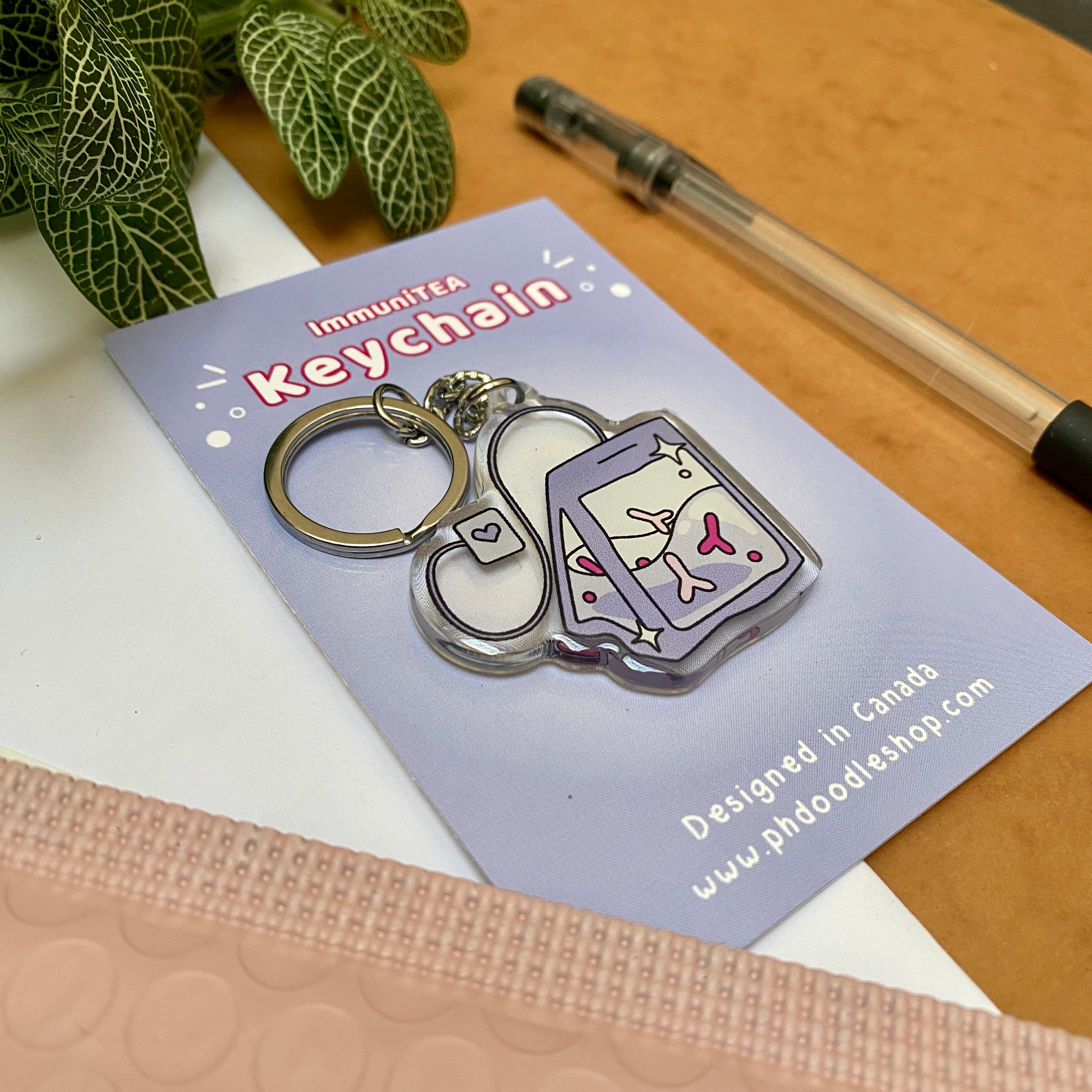 The ImmuniTEA keychain features a tea bag full of little antibodies. The keychain is made of clear acrylic and the illustration is visible on both sides. It is coated with epoxy on both sides for a durable glossy and scratch-resistant finish.