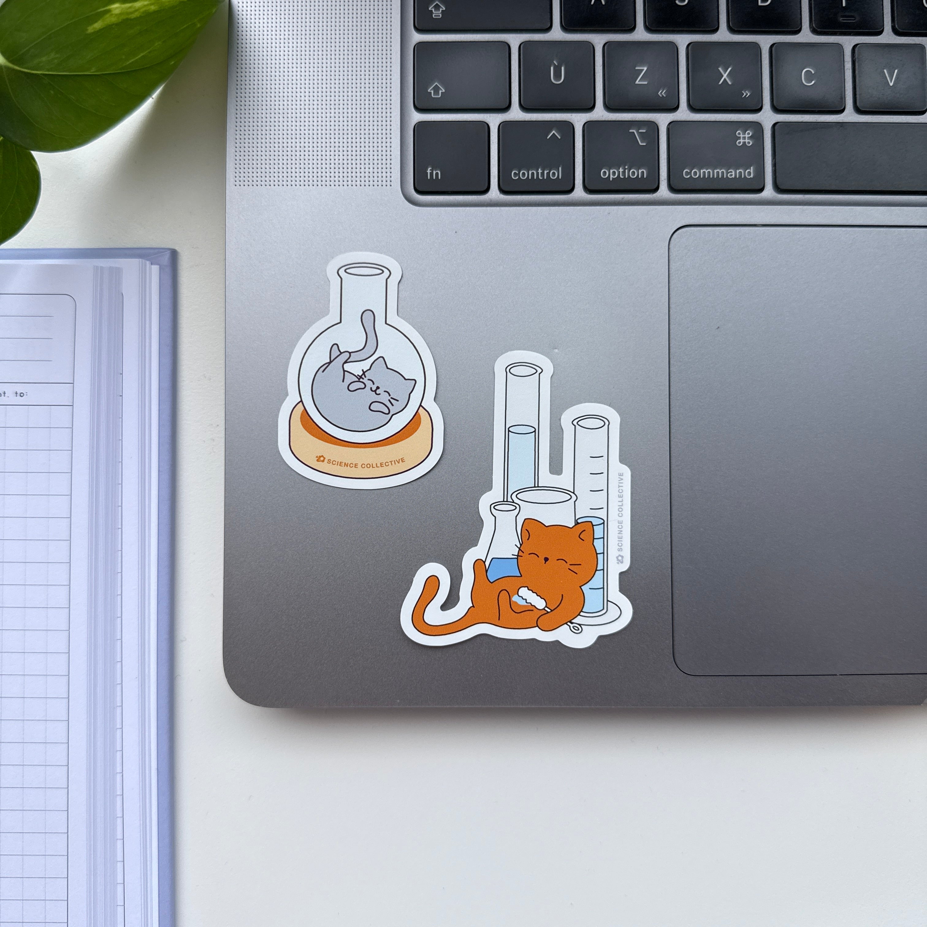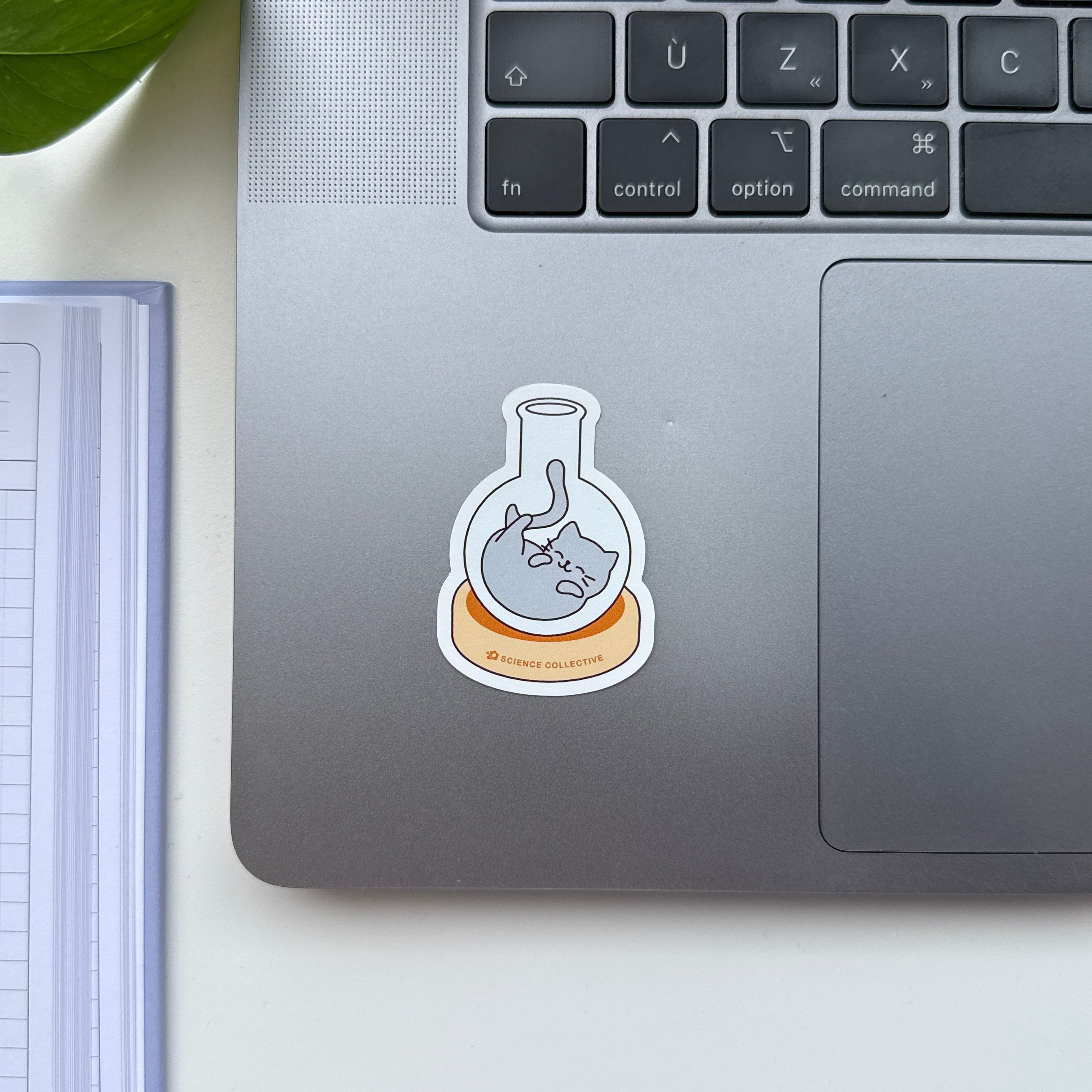Cute chemistry sticker featuring a cat curled up inside a round-bottom flask.Β