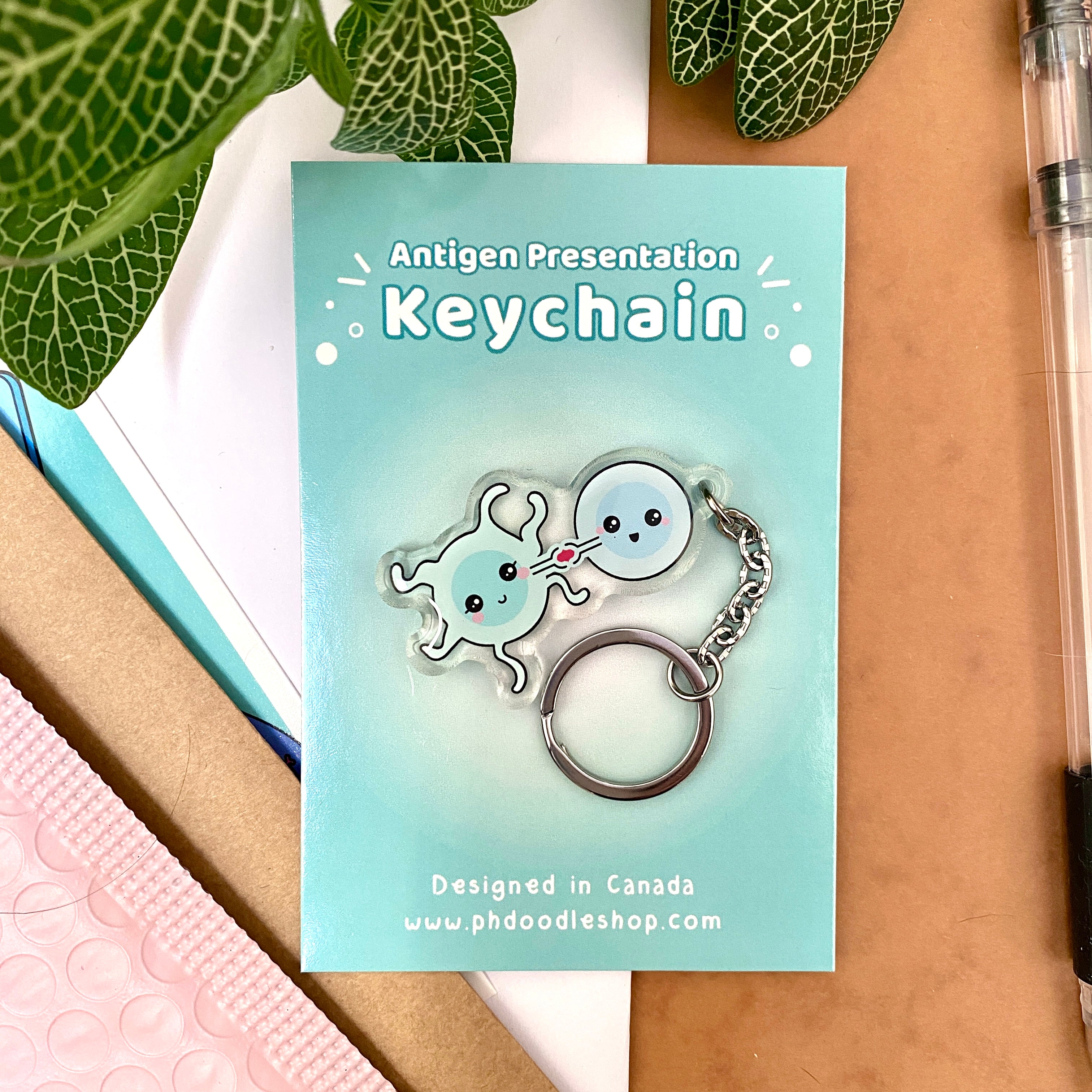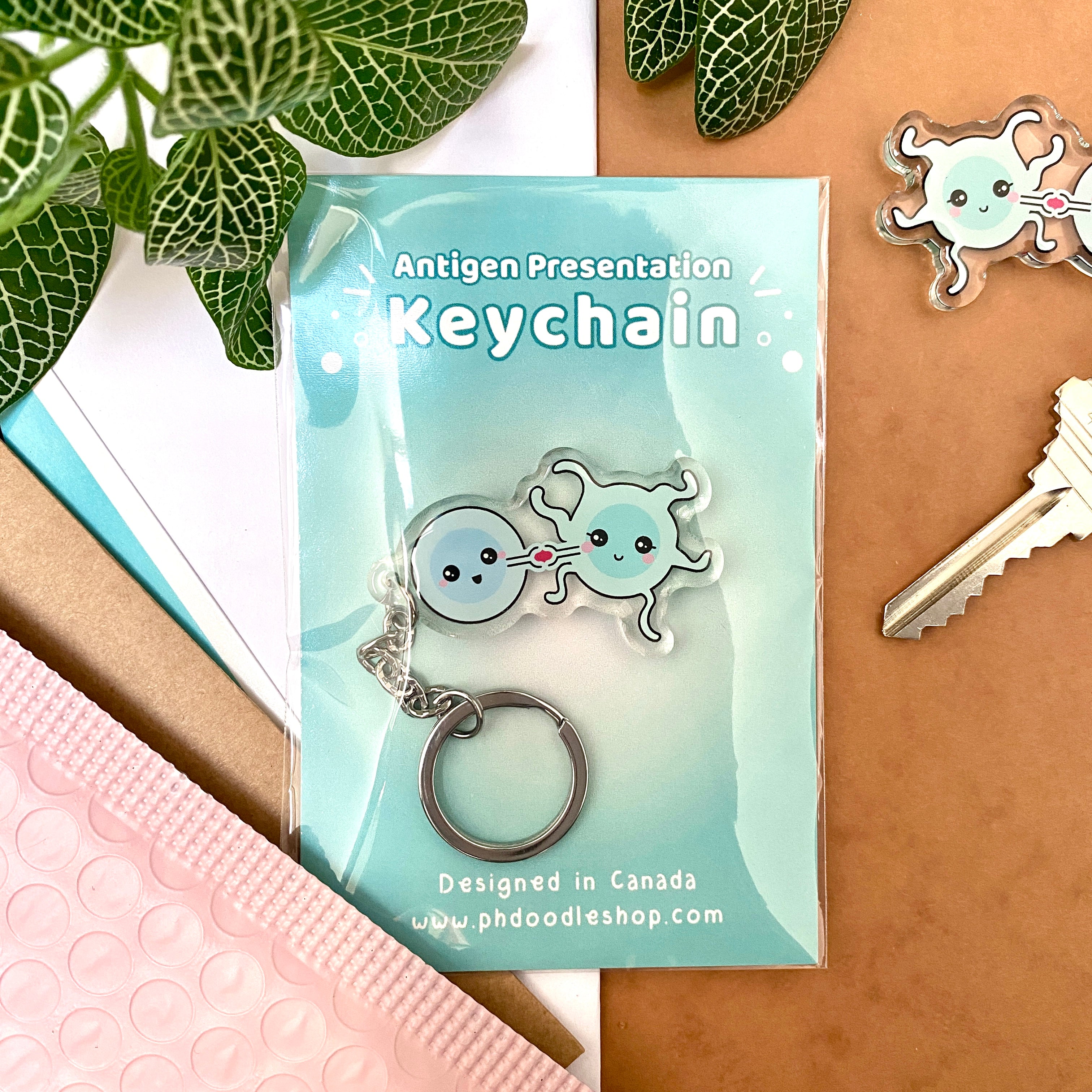 The "Antigen Presentation" keychain features cute immune cells (a T cell and a dendritic cell) interacting during an important immunological process called antigen presentation.