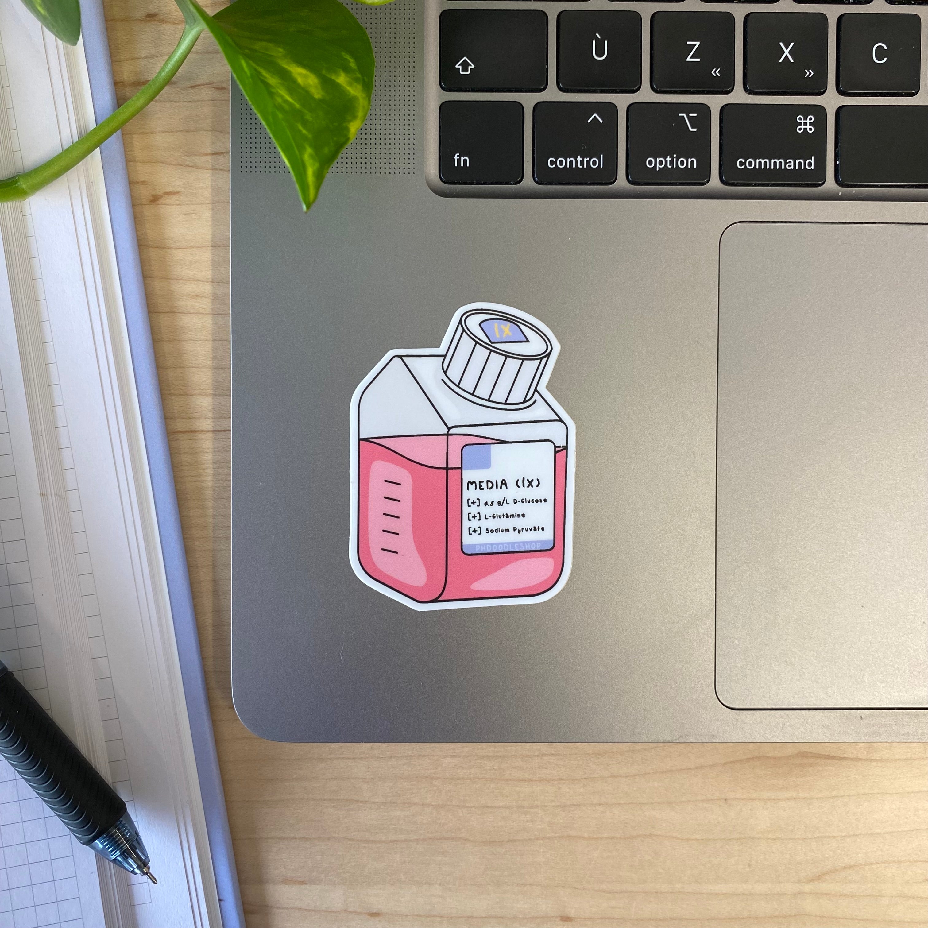 The “Cell culture media bottle” die-cut sticker is made of high-quality vinyl that can be applied to any clean surface including laptops, tablets, phones, water bottles, and notebooks.