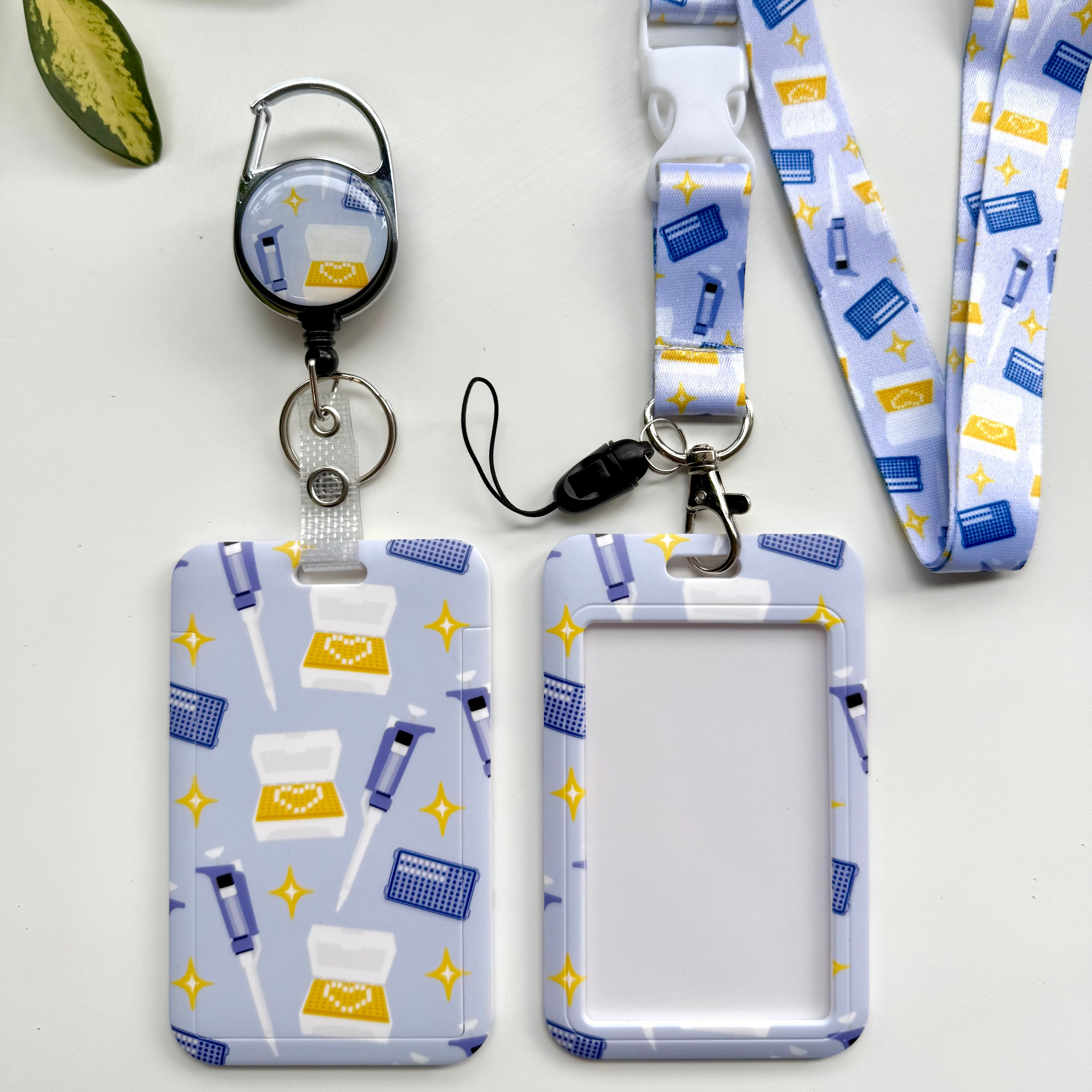 Bring lab life to your everyday essentials with our Micropipette Card Holder Set in a blue colorway. This practical and science-inspired set features a matching lanyard, retractable badge reel, and card holder, all decorated with cute, detailed illustrations of micropipettes and pipette tip boxes.