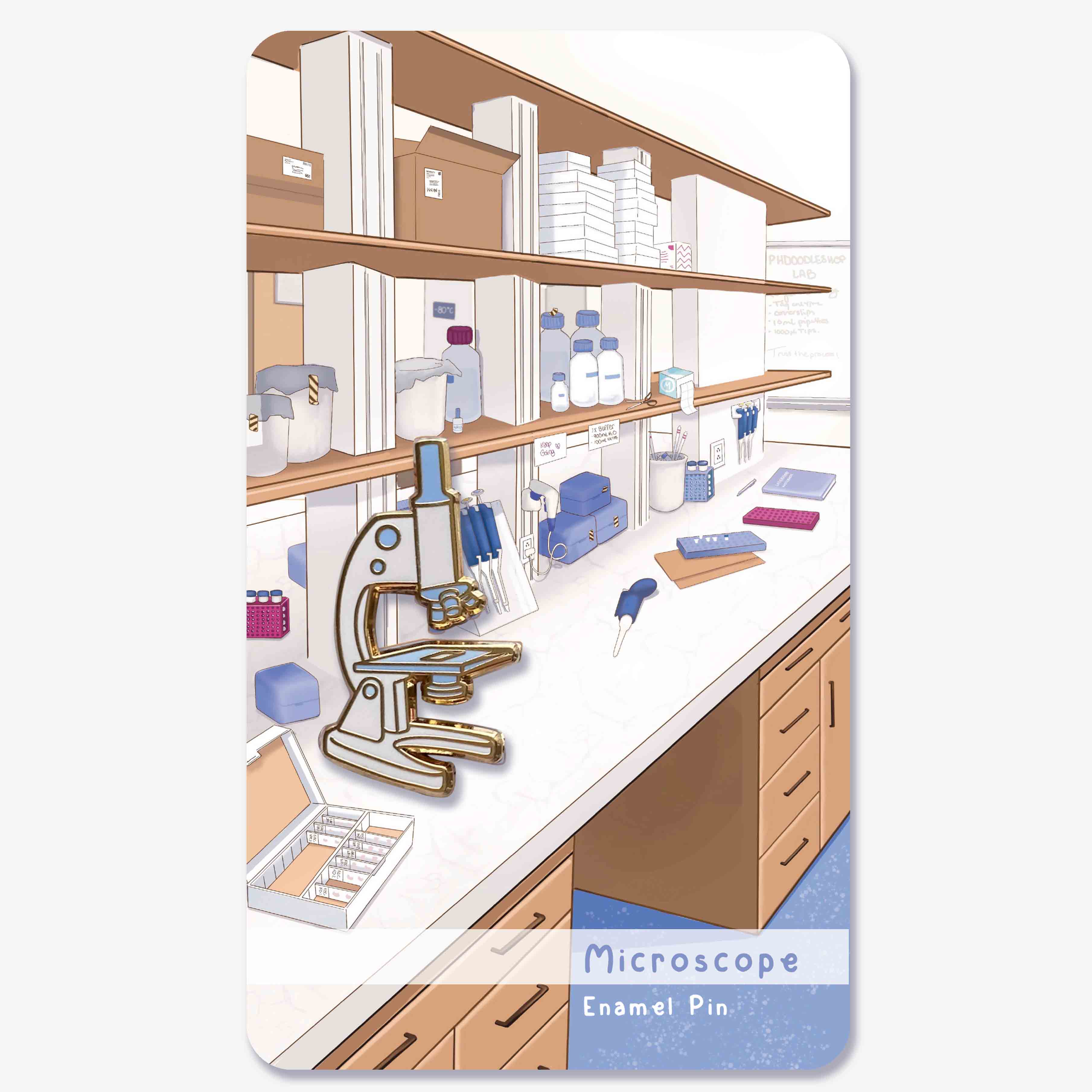 Our microscope enamel pin is seamlessly integrated in the laboratory bench background. Can you find it?