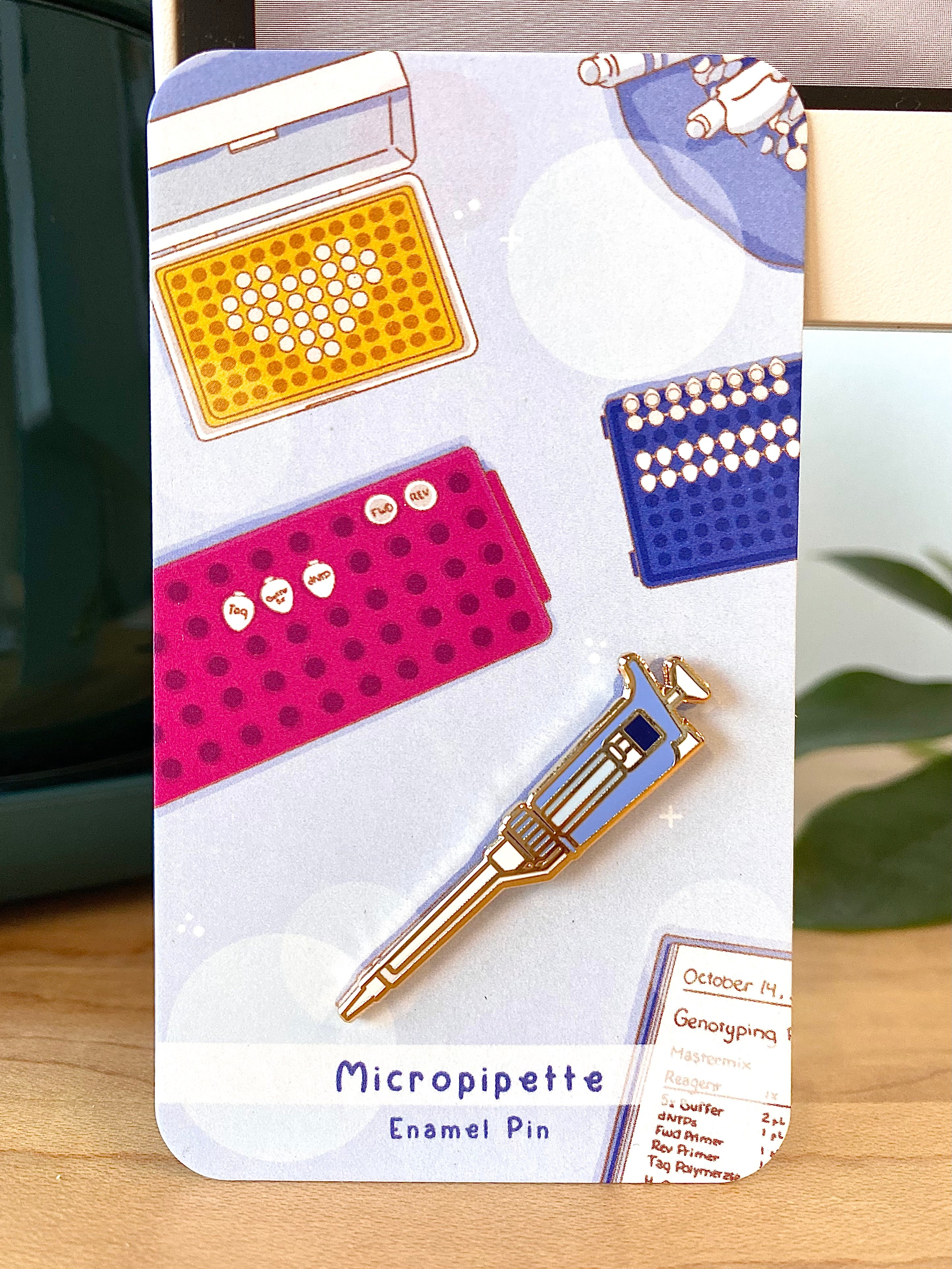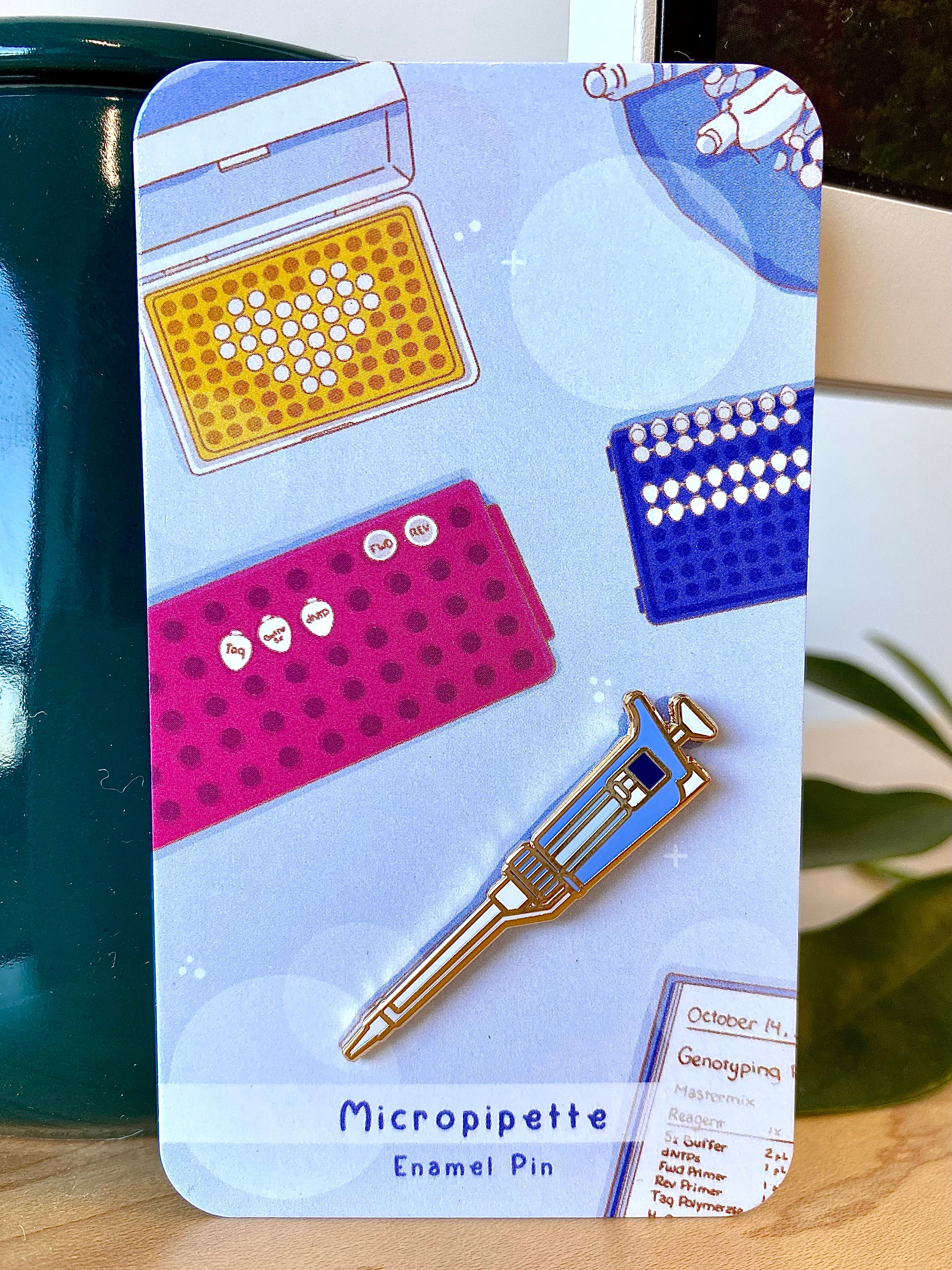 With it's shiny gold plating, it makes for a beautiful ornament to any lab coat or backpack. But what sets this pin apart is its unique backing card, which features a detailed illustration of a laboratory bench set up for a genotyping experiment—a scene familiar to many in the field. It’s more than just a pin; it’s a nod to the everyday life and shared experiences of scientists that drive discovery.