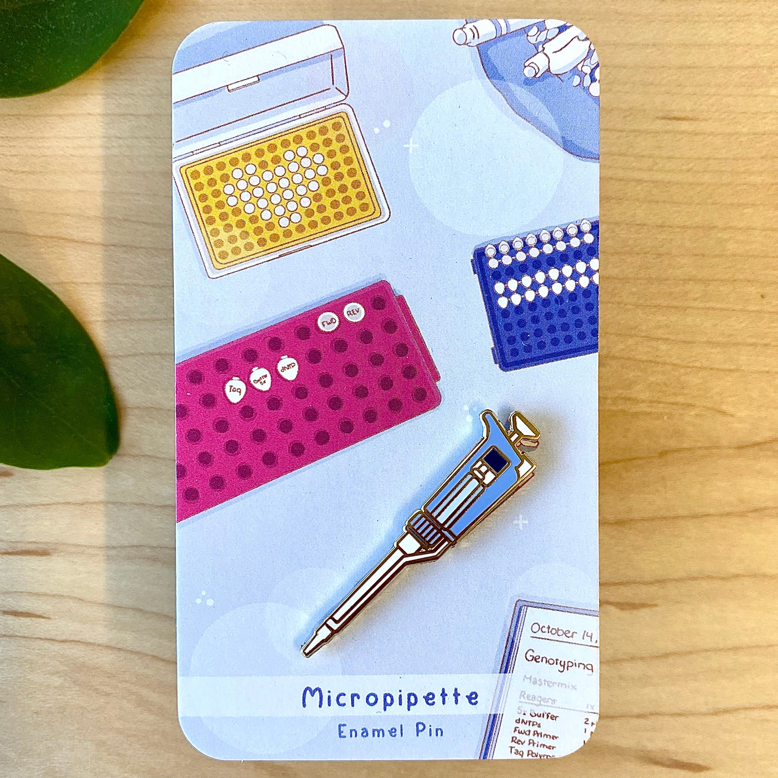 This enamel pin depicts the most commonly used piece of laboratory equipment for most life scientist: the Micropipette!