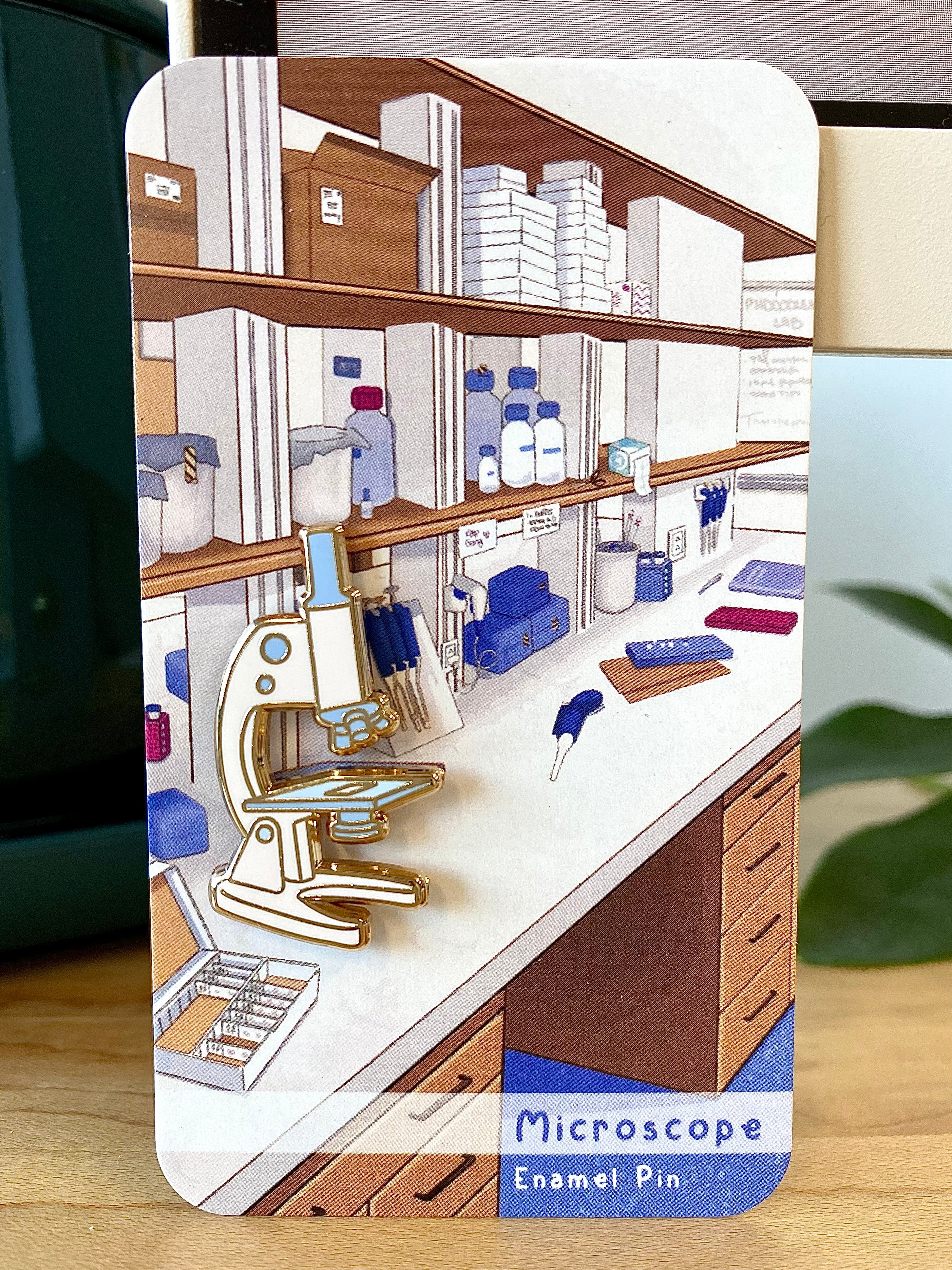 Our microscope enamel pin is seamlessly integrated in the laboratory bench background. Can you find it?