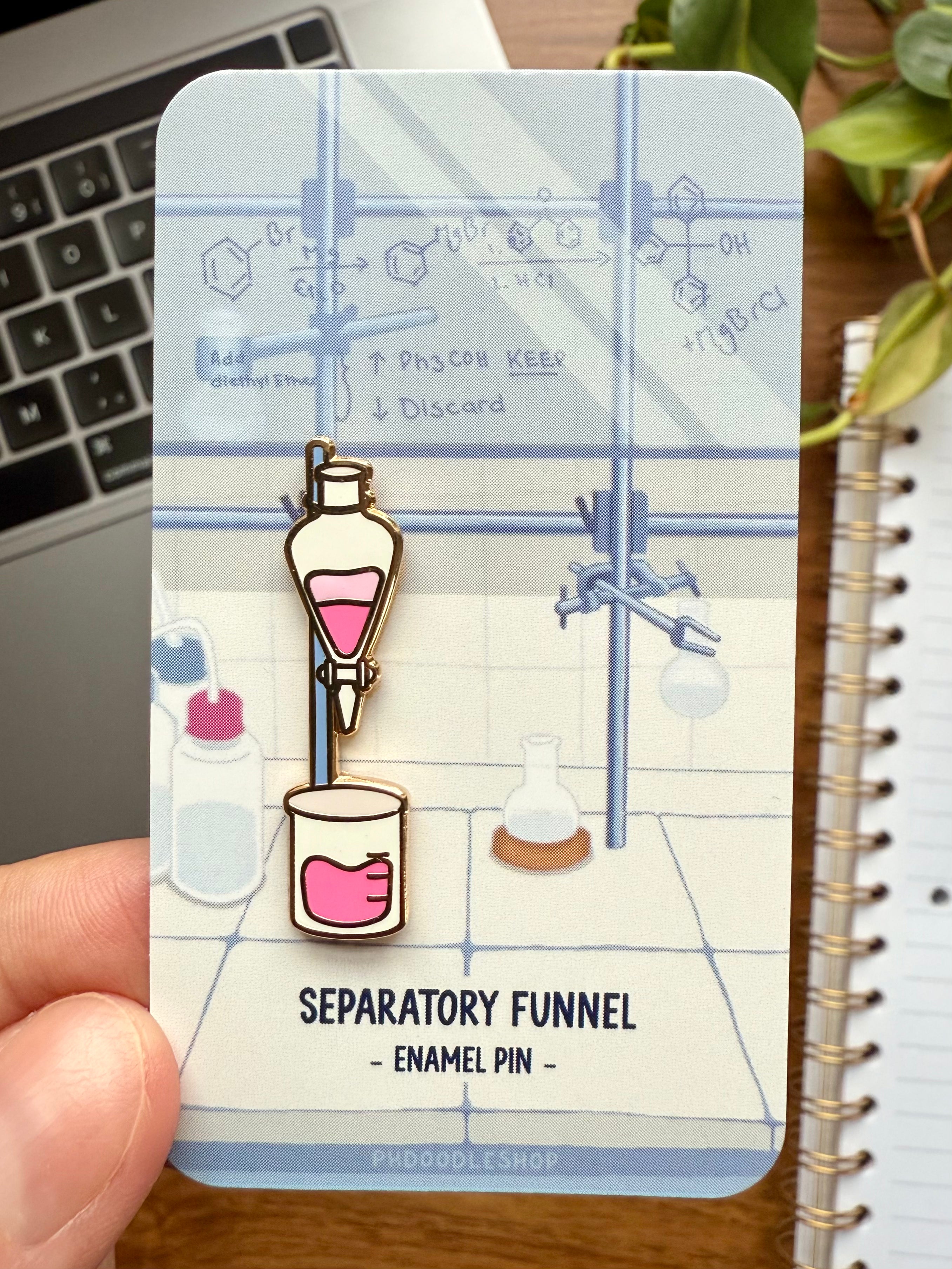 With it's shiny gold plating, this separatory funnel enamel pin makes for a beautiful ornament to any lab coat or backpack. But what sets this pin apart is its unique backing card, which features a detailed illustration of a chemistry laboratory bench. It’s more than just a pin; it’s a nod to the everyday life and shared experiences of scientists that drive discovery.