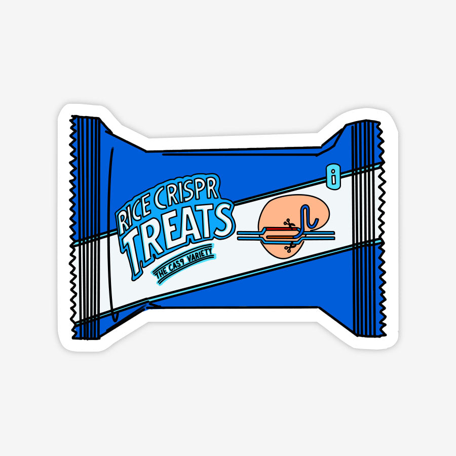 This “Rice CRISPR Treats” sticker puts a genetics spin on a classic crispy snack wrapper, swapping the usual branding for a fun CRISPR–Cas9 design and bold blue packaging that lab scientists will instantly recognize.