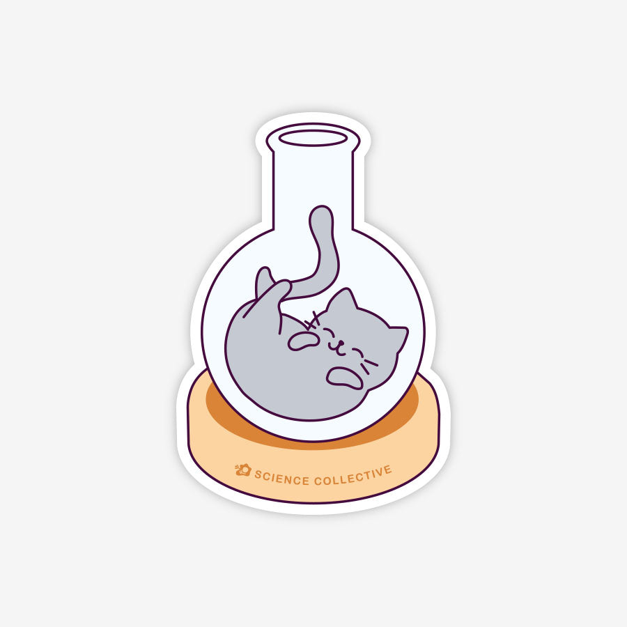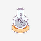 Cute chemistry sticker featuring a cat curled up inside a round-bottom flask.