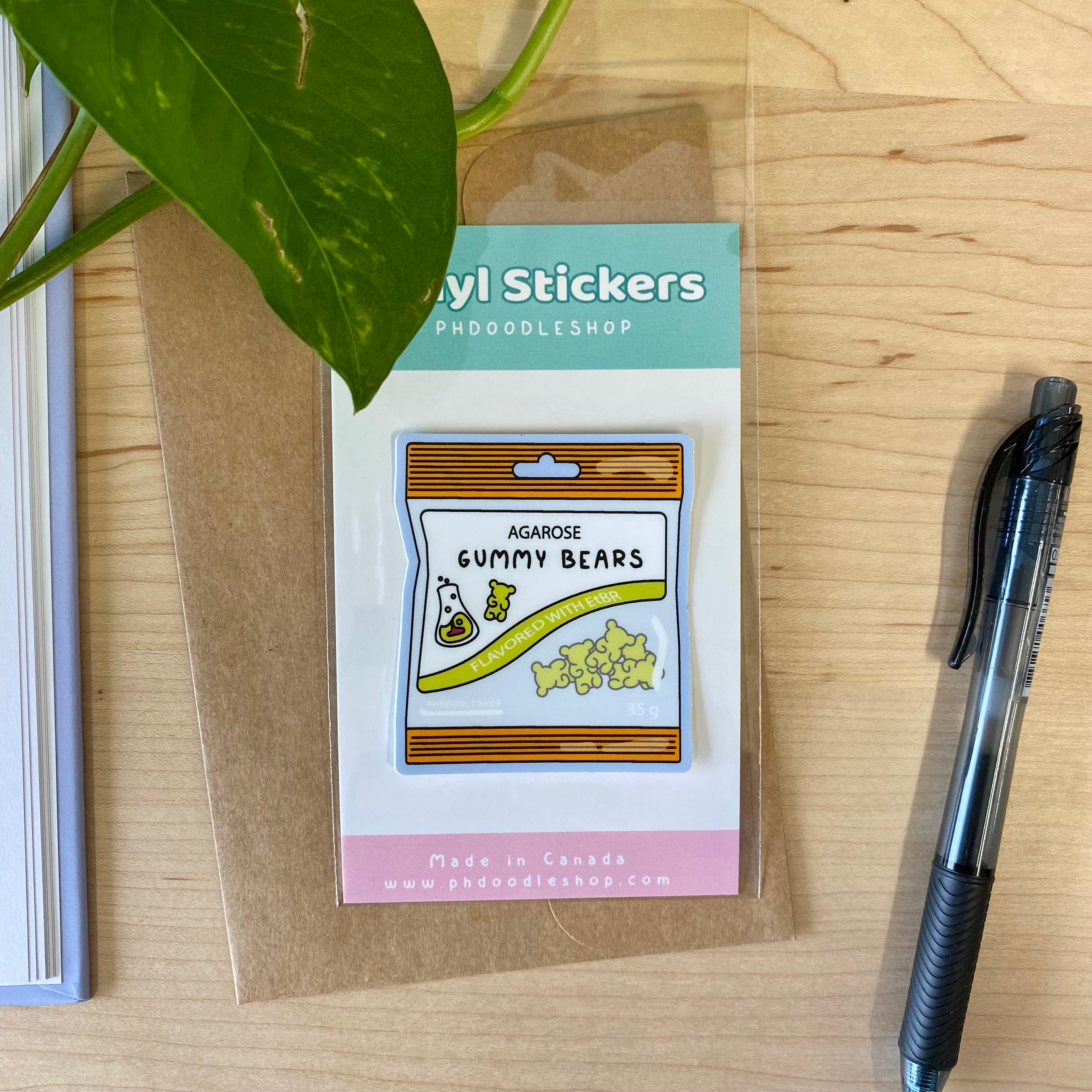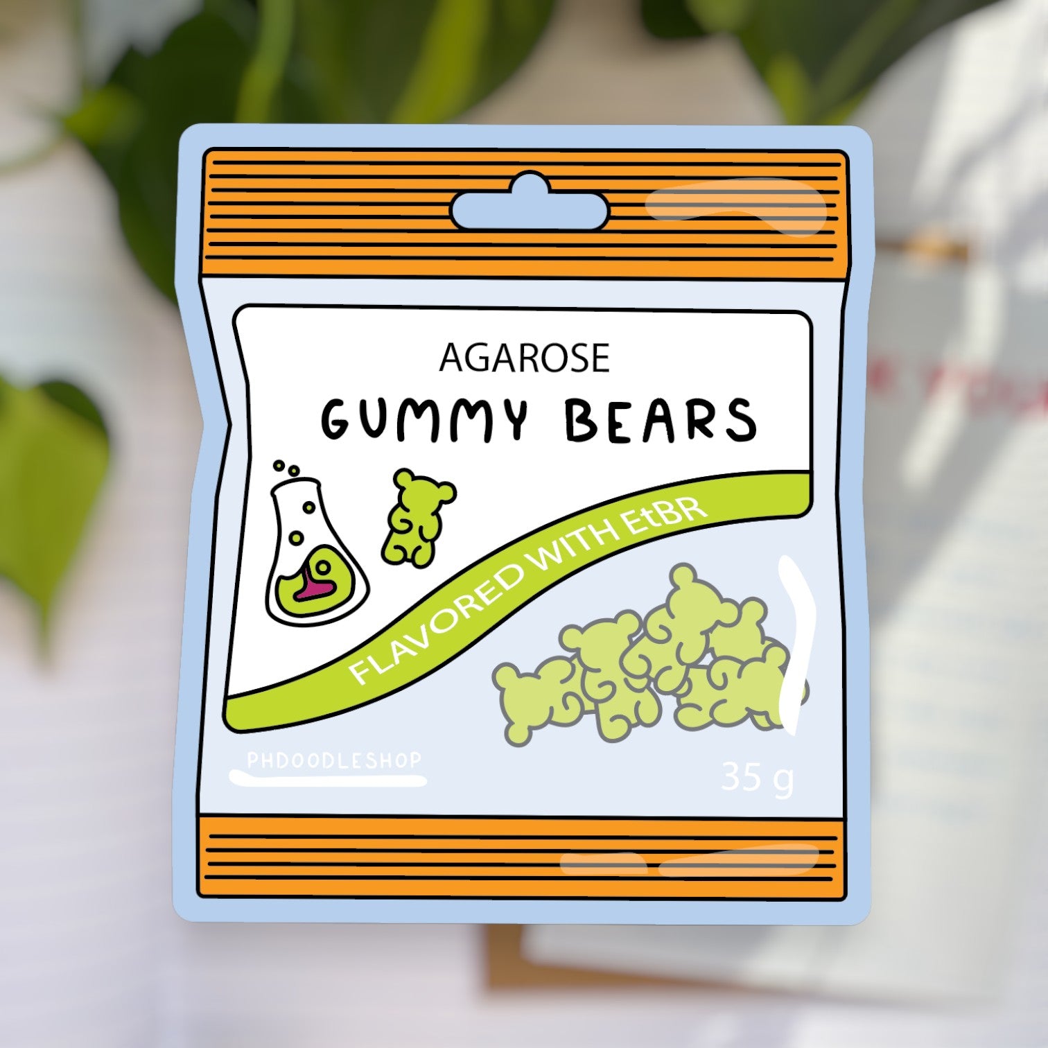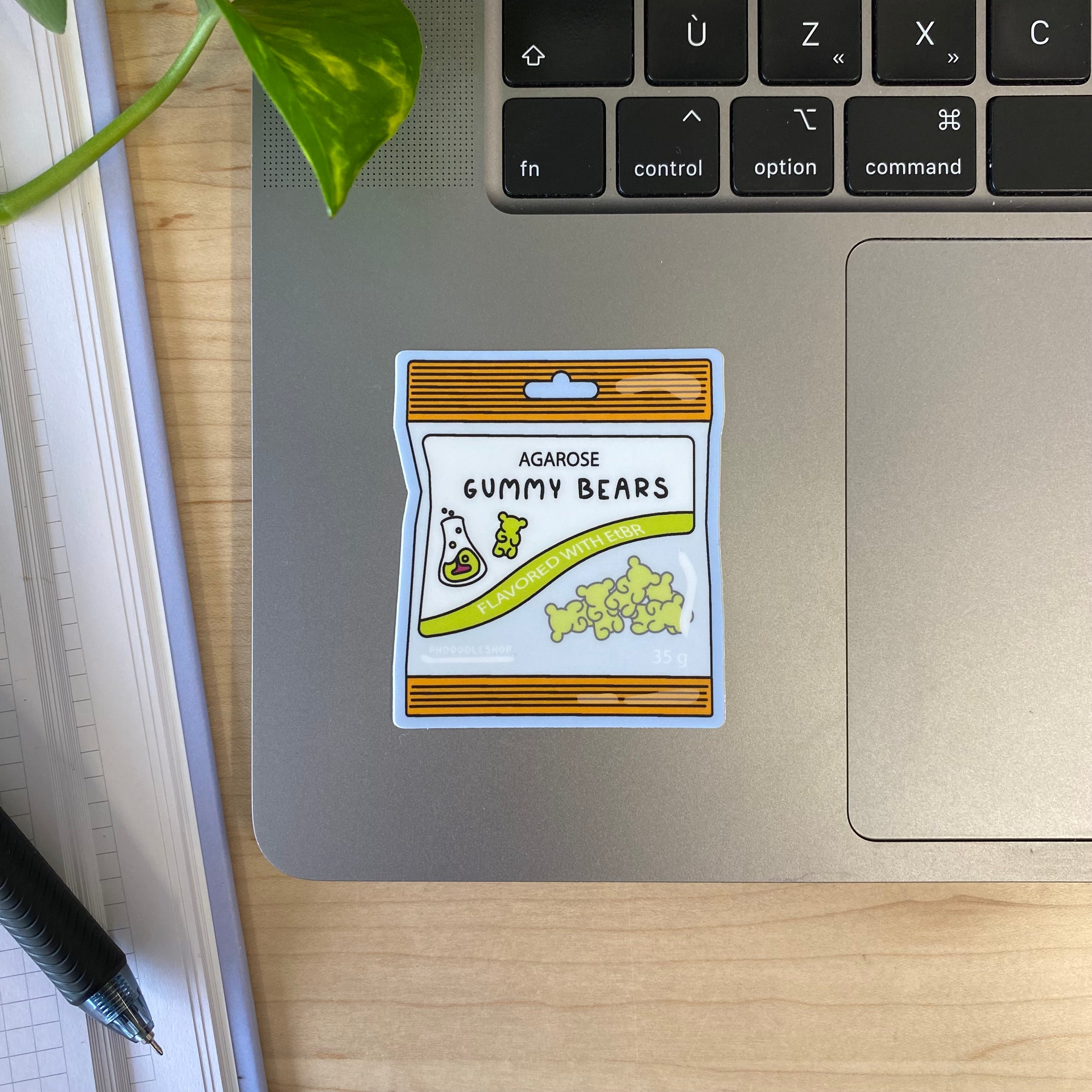 The Agarose Gummy Bears die-cut sticker is made of high-quality vinyl that can be applied to any clean surface including laptops, tablets, phones, water bottles, and notebooks.