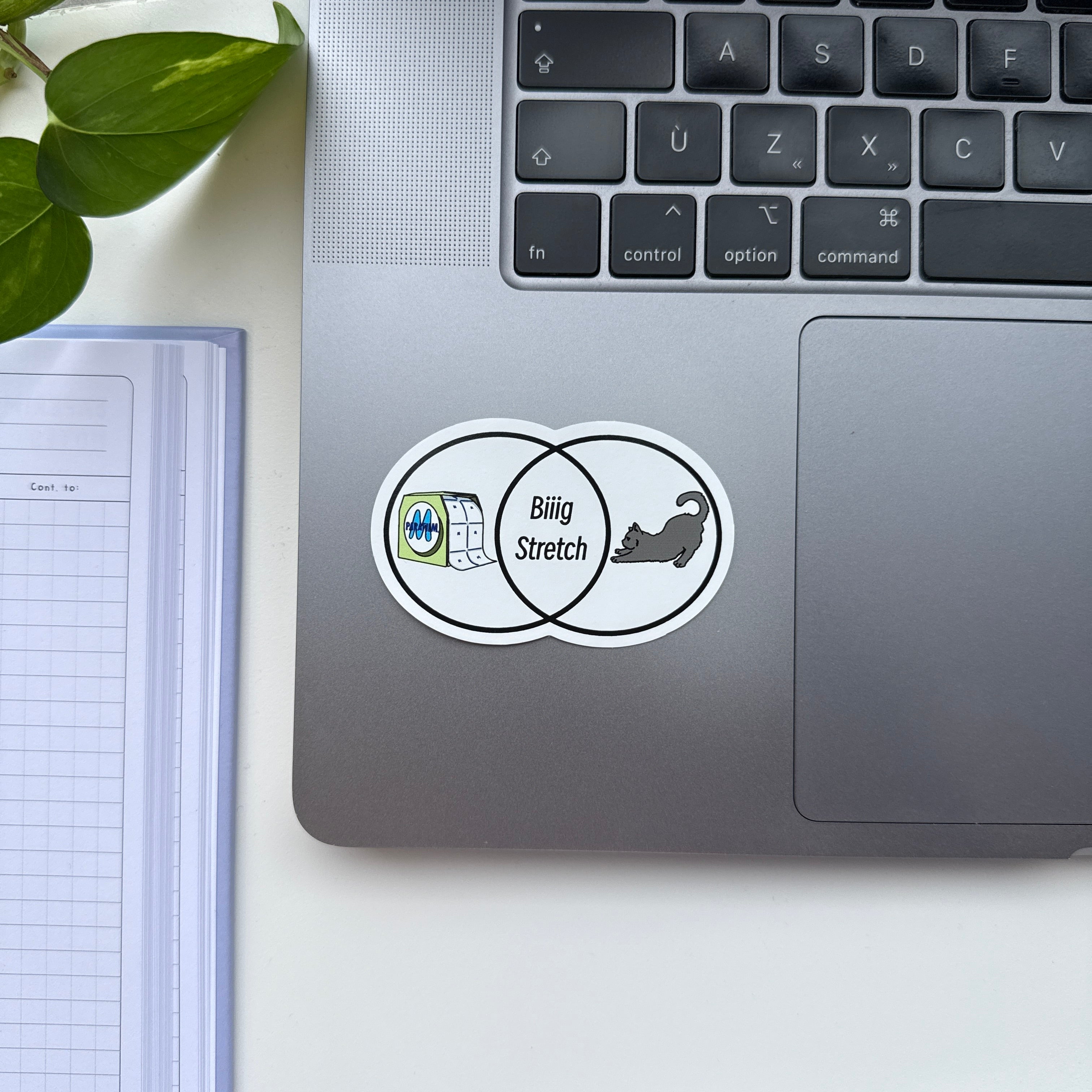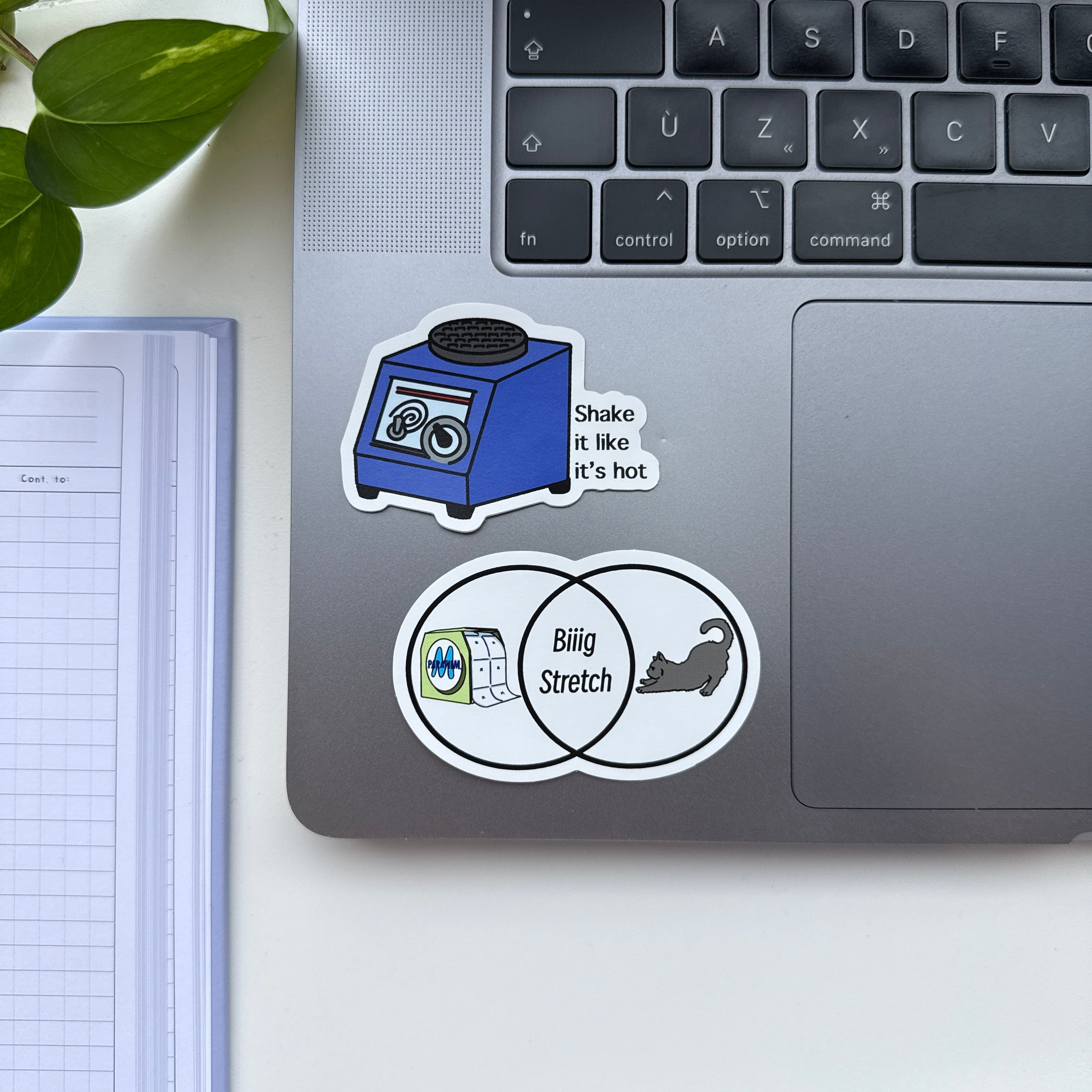 This “Big Stretch” sticker uses a simple Venn diagram to make a classic lab joke, pairing a roll of Parafilm with a stretching cat to highlight their one shared superpower: serious stretch.