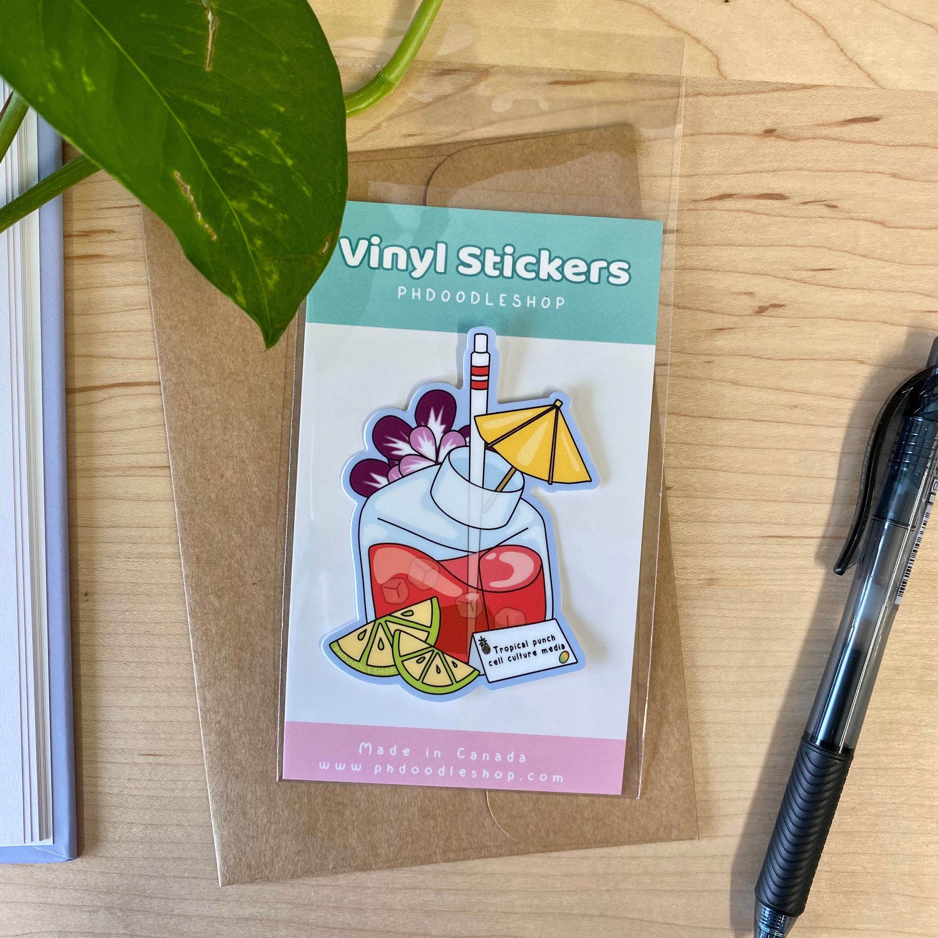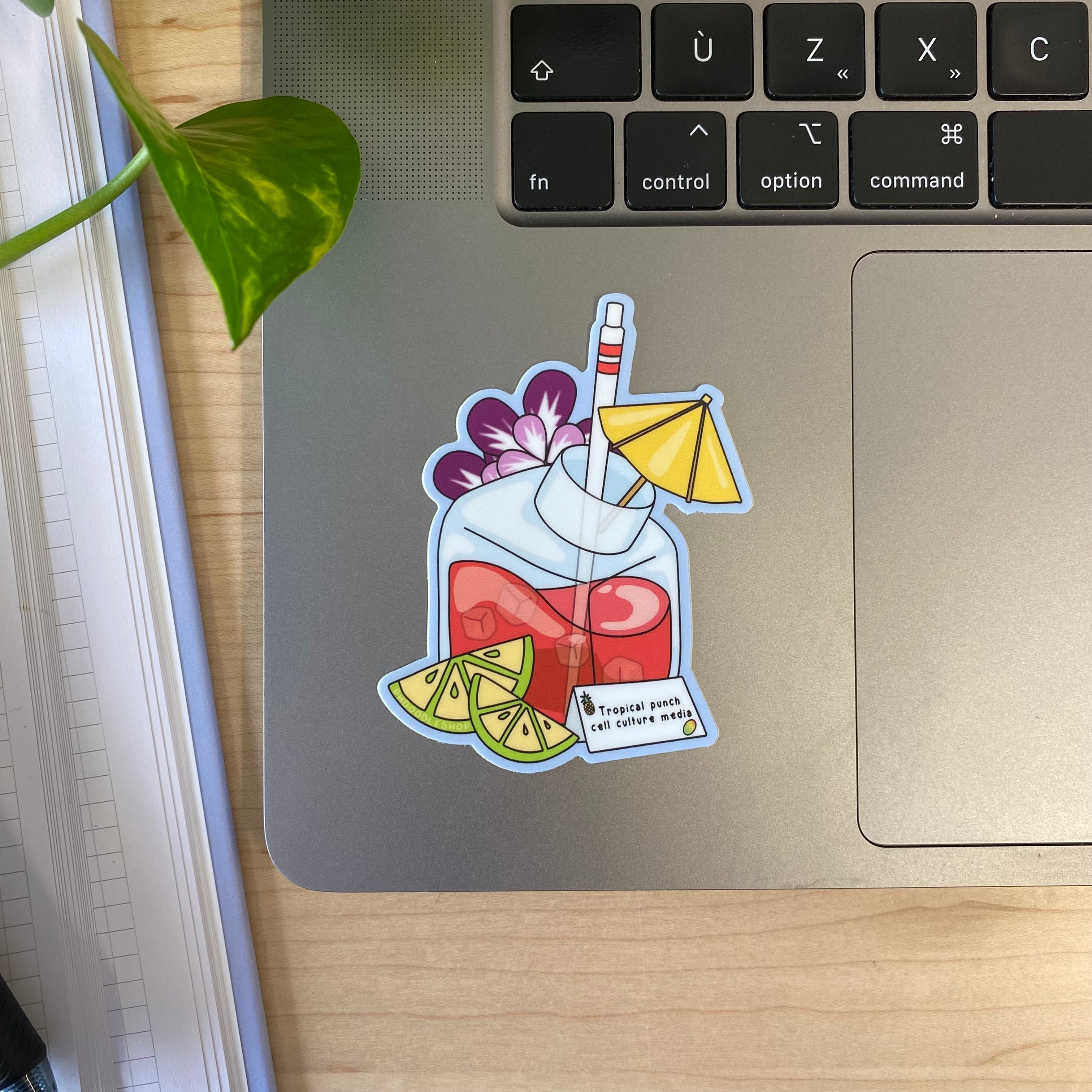 The cell culture tropical punch die-cut sticker is made of high-quality vinyl that can be applied to any clean surface including laptops, tablets, phones, water bottles, and notebooks.
